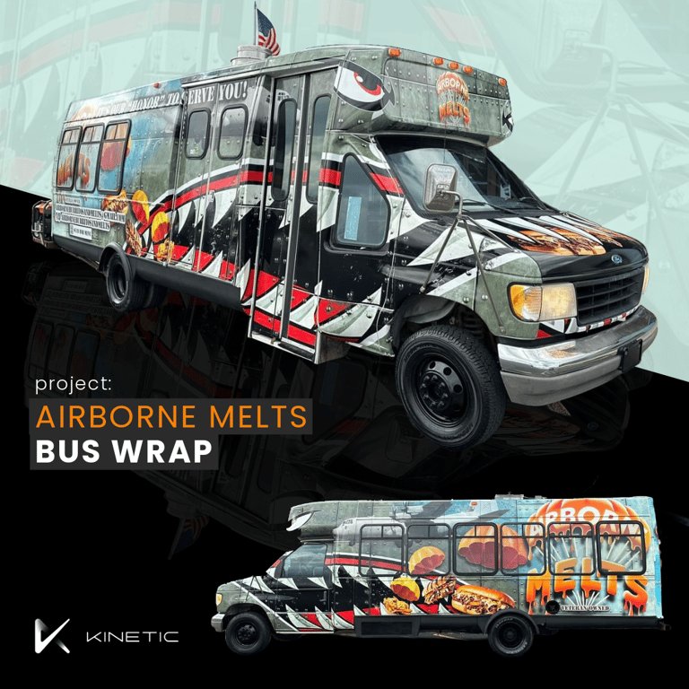 I recently had the incredible opportunity to design a bold and exciting bus wrap for Airborne Melts, a delightful food truck business based in Michigan. This project allowed me to channel my creativity into crafting a design that truly stands out on the road, making the most of eye-catching elements that represent their mouth-watering grilled cheese melts.