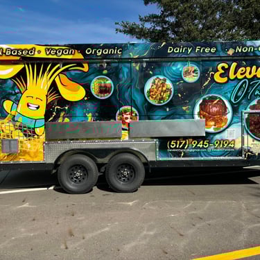 Discover a vibrant food truck wrap for Eleven O Two that showcases their fun, plant-based menu and brings fresh energy to the streets!