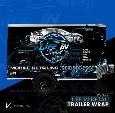 At KINETIC Designs, we take pride in crafting designs that not only stand out but also serve as dynamic marketing tools for businesses. One of our latest projects involved collaborating with Greenback Wraps on a trailer wrap for a Michigan-based mobile detailing business, Life In Detail. This design reflects the precision and dedication that Life In Detail delivers to its customers.
